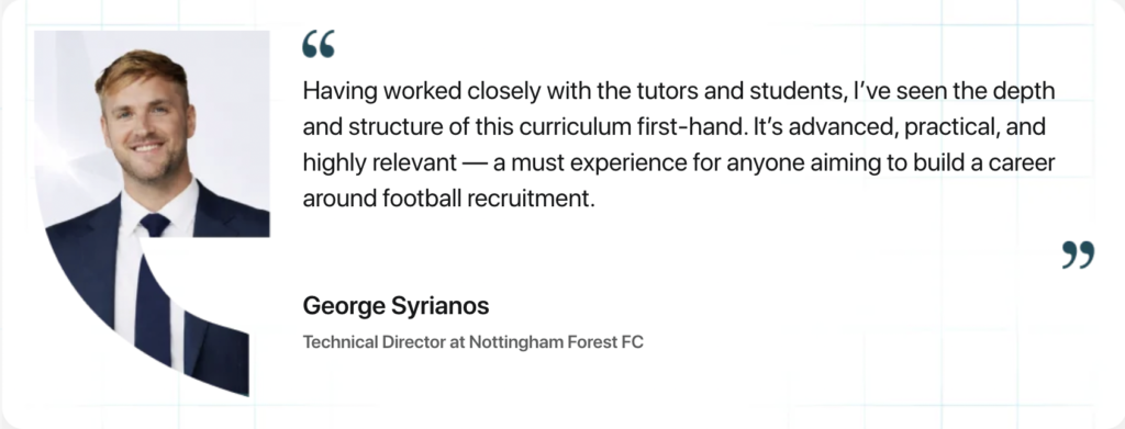 This course changed my life. From an island in Greece, I became Lead Recruitment Analyst at Nottingham Forest thanks to the knowledge I gained and the opportunities it opened.
